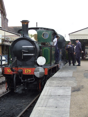 Getting up steam, double header locomotives 178 and 323 approach Sheffield Park whilst the station staff discuss the forthcoming departure.
